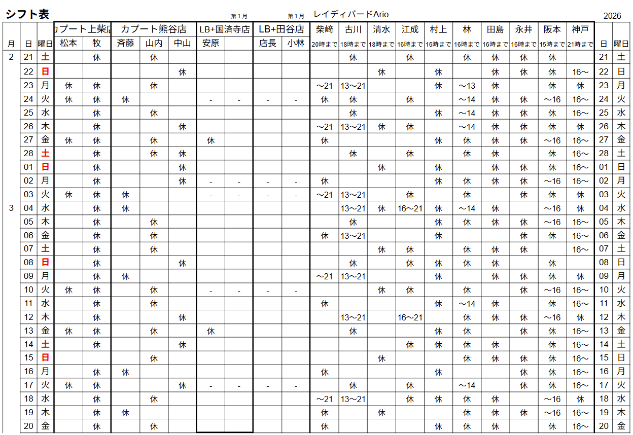 下記4店舗のスタッフの出勤状況(スタッフのお休み)